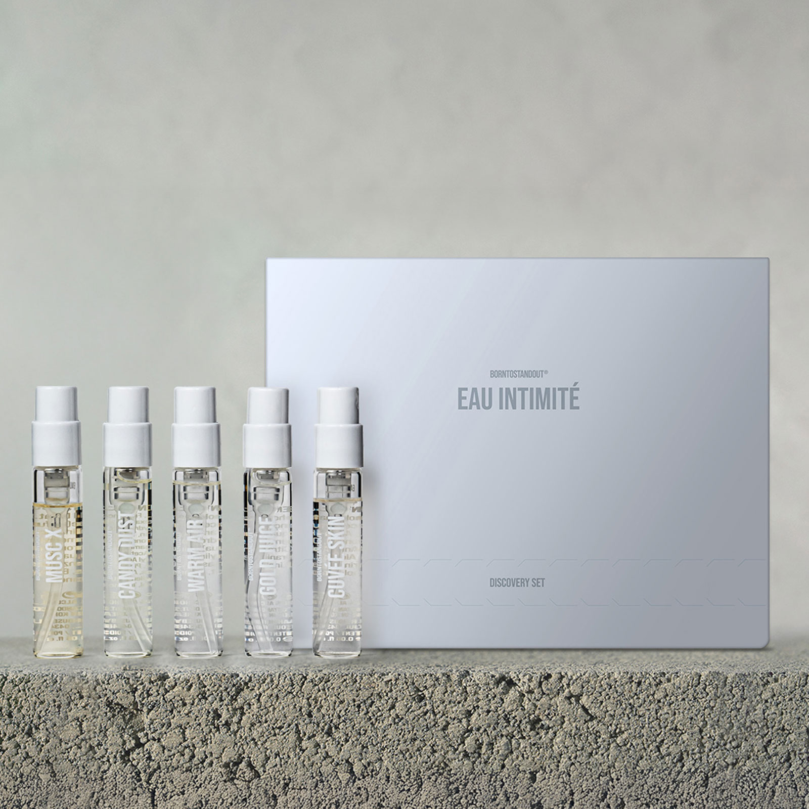 В набор EAU INTIMITÉ входит: Туалетная вода CUVÉE SKIN 2 мл; Туалетная вода WARM AIR 2 мл; Туалетная вода GOLD JUICE 2 мл; Туалетная вода CANDY DUST 2 мл; Туалетная вода MUSC X 2 мл.