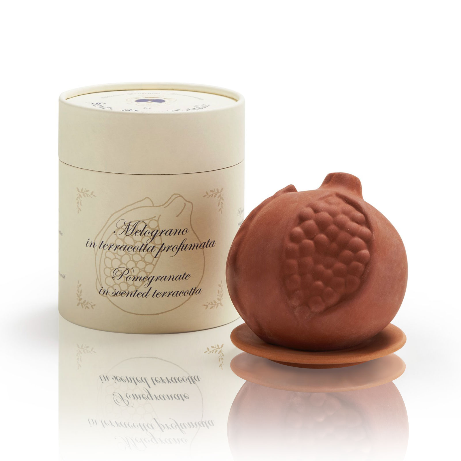 Изделие пропитано ароматом Мелограно, созданным Домом Officina Profumo Farmaceutica di Santa Maria Novella в 1965 году. Глина позволяет запаху постепенно испаряться, ароматизируя помещение (6-12 месяцев, в зависимости от размера помещения). Подставка-тарелочка идет в комплекте с гранатом.